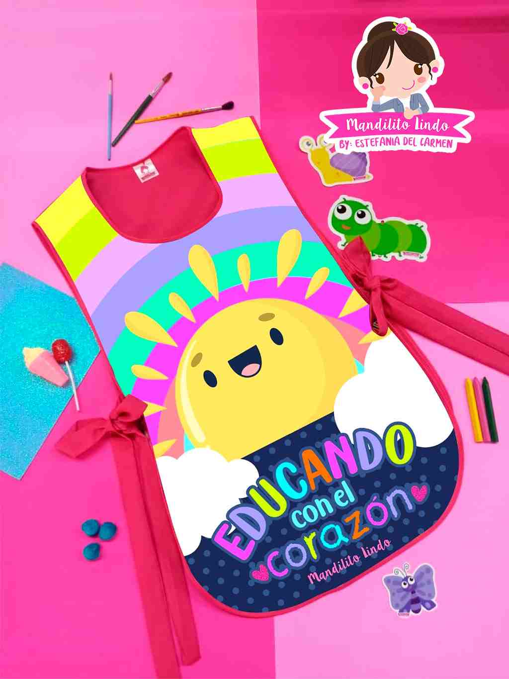 Este Mandilito Lindo es para aquellas educadoras que son extremadamente creativas y soñadoras. Todos nuestros productos están hechos en telas de la más alta calidad, resistentes, con colores vivos que no se despintan; todo el ciclo escolar parecerá que es nuevo, además son telas de secado rápido. Las costuras de bolsas y tiras vienen reforzadas para ofrecerte un producto de calidad. El monedero y otros accesorios se venden por separado. Hacemos envíos a toda la república. Comprar con nosotros es muy seguro y fácil.