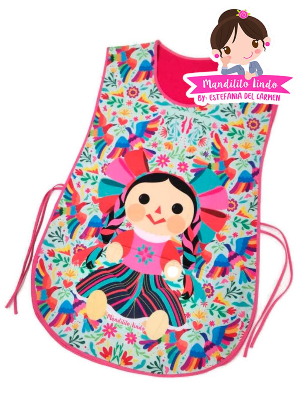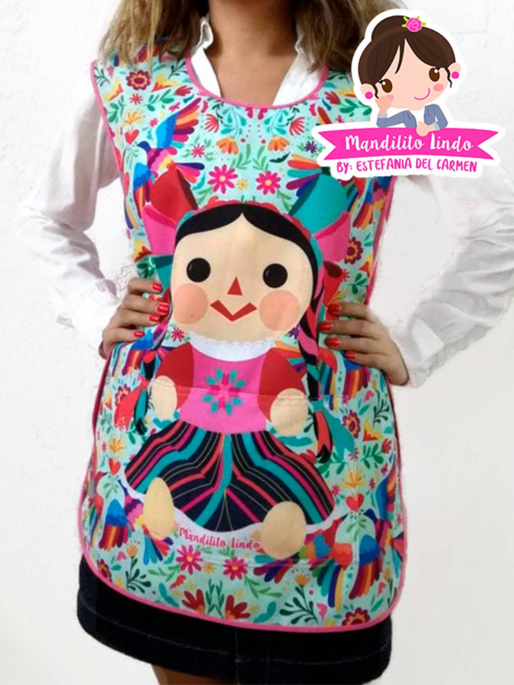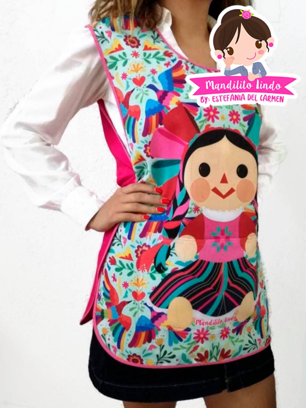 Con este hermoso diseño podrás lucir con mucho estilo y orgullo nuestras bellas tradiciones mientras haces la linda labor de la enseñanza. La batita tiene una bolsa grande al frente que mantiene el mismo diseño al del fondo de este modo se conserva el hermoso dibujo sin perder la bolsa al frente. Todas nuestras batas y mandiles están hechas en telas de la más alta calidad, resistentes, con colores vivos que no se despintan y duran todo el ciclo escolar sin perder intensidad, además son telas de secado rápido. El monedero y otros accesorios se venden por separado. Hacemos envíos a toda la república. Comprar con nosotros es muy seguro y fácil.