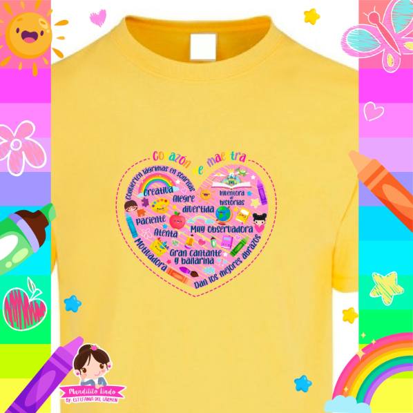 Nuestra playera corazón de maestra, es una playera cuyo diseño representa lo que esta en el corazón de las maestras. Atrévete a mostrar tu personalidad con una playera de Mandilito Lindo y descubre todos los diseños que tenemos en nuestra página web para ti.